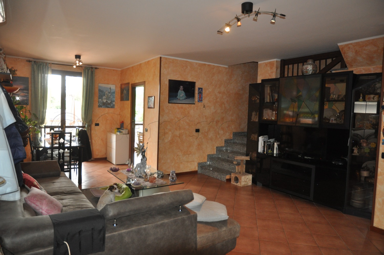 Al Piano Terra: ingresso nel caldo e accogliente soggiorno e cucina abitabile entrambi con uscita diretta sul Giardino di circa 350mq, bagno di servizio;